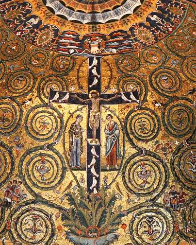 W V I VI w. Bardzo rozpowszechniły się gemmy w formie krzyży. Zawieszano je jako wota w bazylikach albo służyły jako krzyże do błogosławieństw i relikwiarze, jako krzyże procesyjne i ołtarzowe. W malarstwie ściennym i w sztuce mozaikowej zajmują miejsce centralne. Krzyże o różnych wielkościach i wykonane różną techniką, umieszczane na stopniach, na tronach, pod łukami triumfalnymi, wypuszczające pędy i kwiaty- mówią wszędzie o zwycięstwie, życiu i radości; są typami przemienionego Chrystusa. Prudencjusz opisując w poemacie malowidła ścienne jednego z Kościołów, mówi o scenie ukrzyżowania. Ukrzyżowania na plakietach z kości słoniowej, na cyprysowych drzwiach kościoła św. Sabiny w Rzymie.